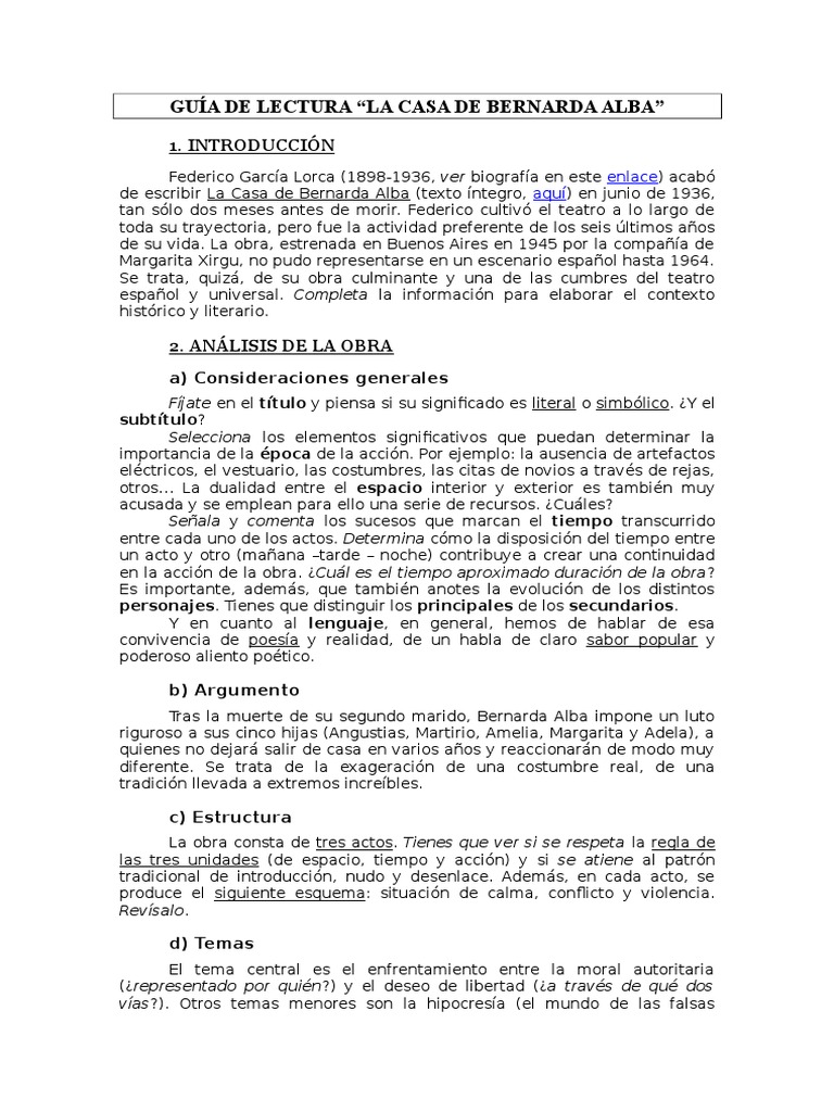 A drama about women in the villages of spain, or la casa de bernarda alba, is a play by spanish poet, dramatist, and director, federico garcía lorca, that explores themes of sexual repression, inheritance, and violence among three generations of women in rural spain.the play was lorca's last, completed in 1936 only months before his murder at the hands. Resumen de la casa de bernarda alba. La casa de bernarda alba. La casa de bernarda alba fue terminada en 1936 y es la última de las obras trágicas de garcía lorca escrita antes de su muerte. Lorca did not include it in his plan for a trilogy of the spanish land (which remained unfinished at the time of his murder).
